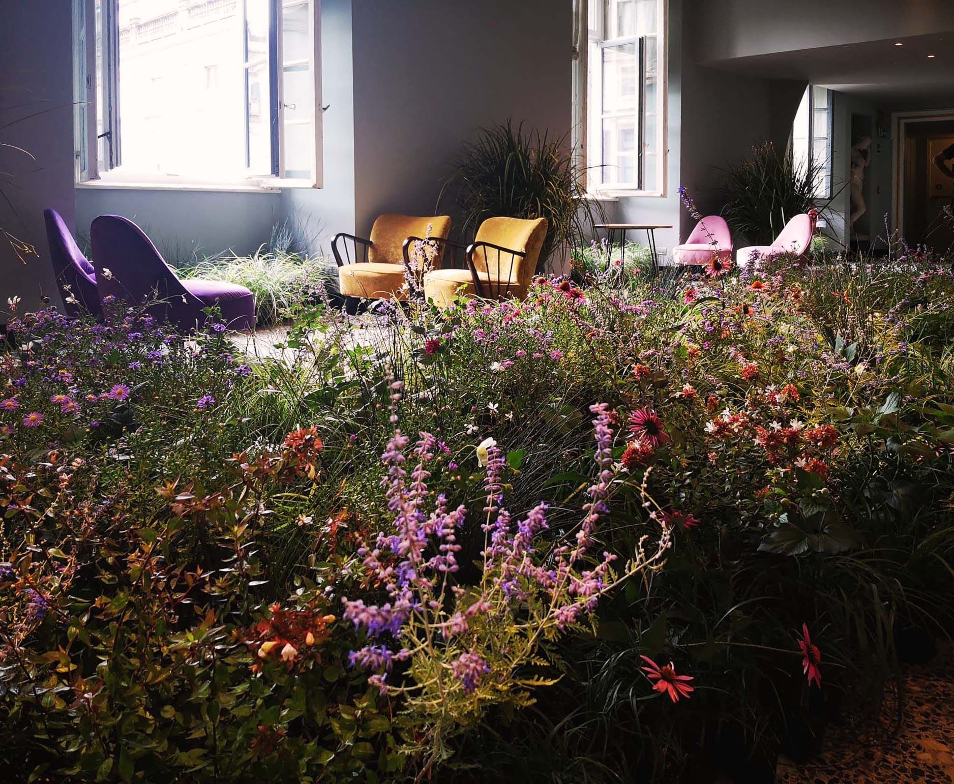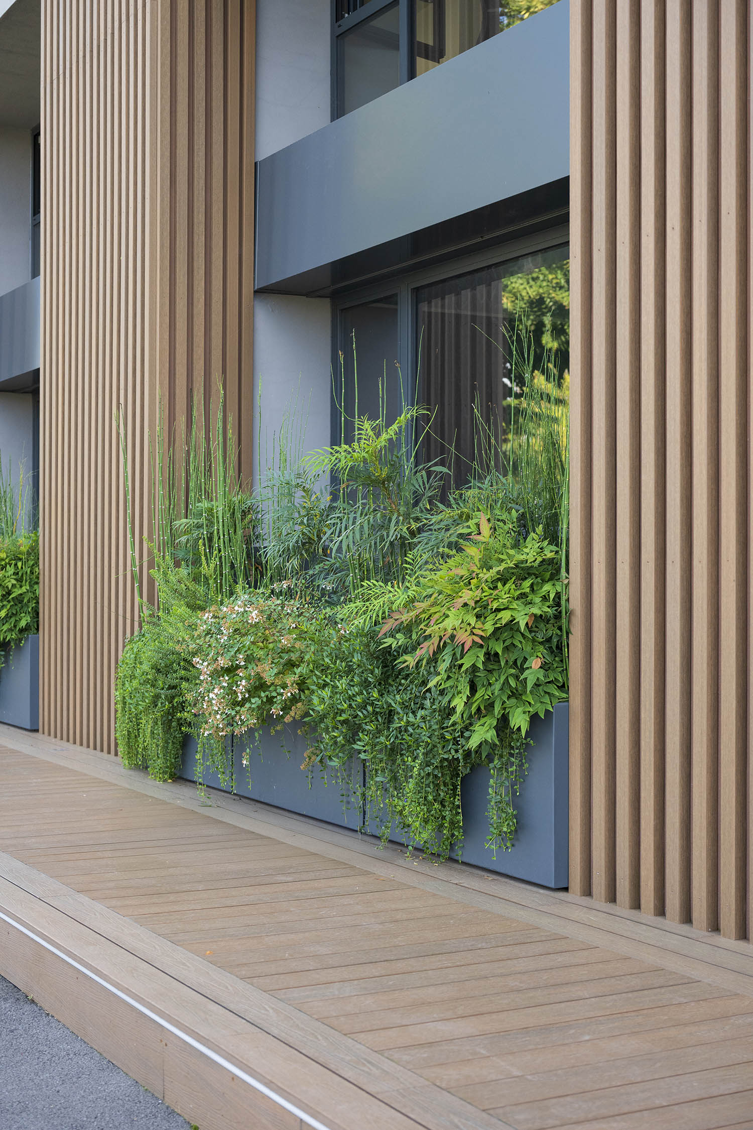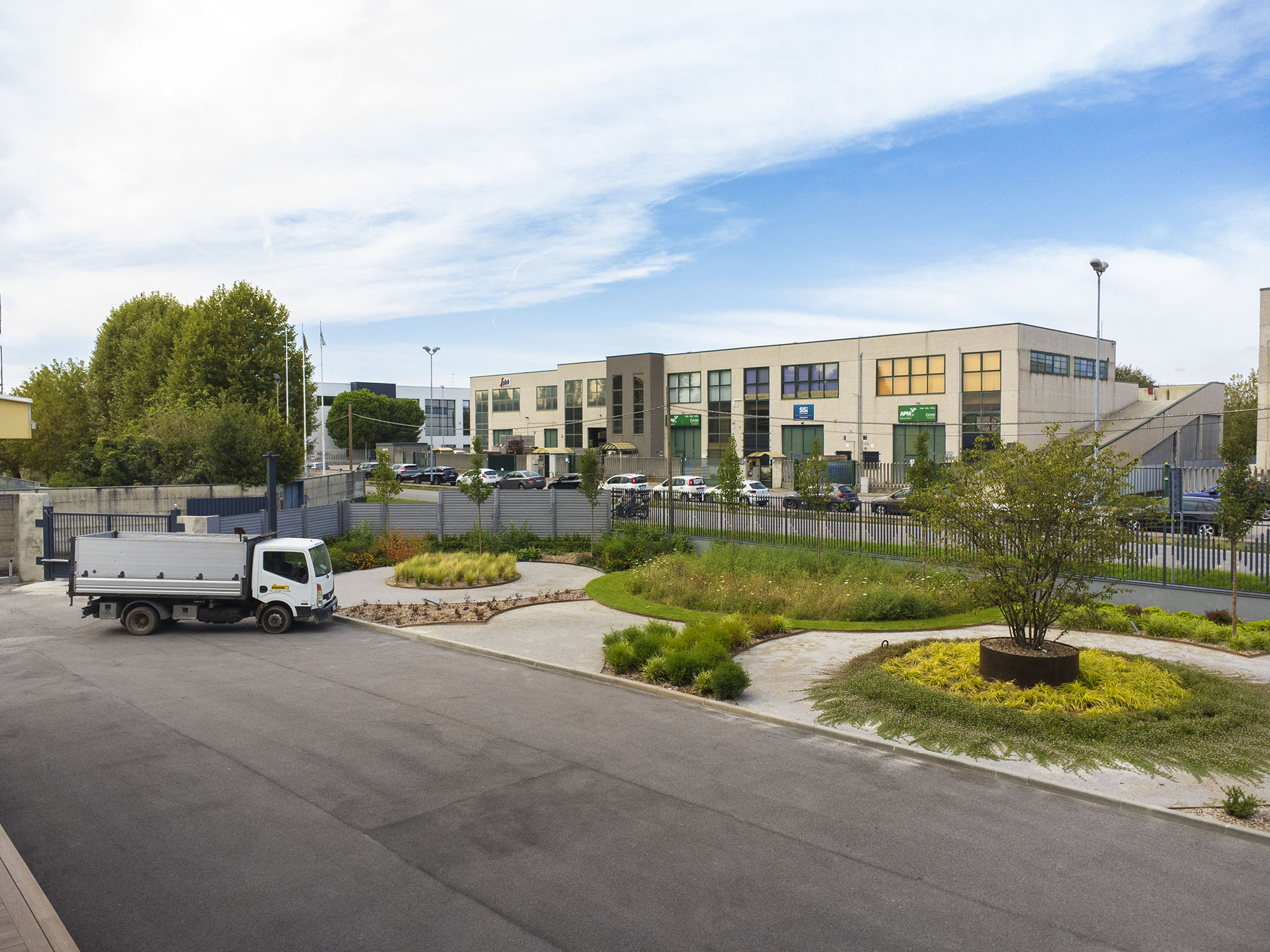 All’interno di questo schema si inseriscono importanti alberature come punti focali, bordure naturalistiche e tappeti di prato mediterraneo a bassa manutenzione, scelti per garantire stagionalità, biodiversità e sostenibilità. Ogni area diventa così un esempio applicato: dalle aiuole miste alle soluzioni per spazi aziendali contemporanei.