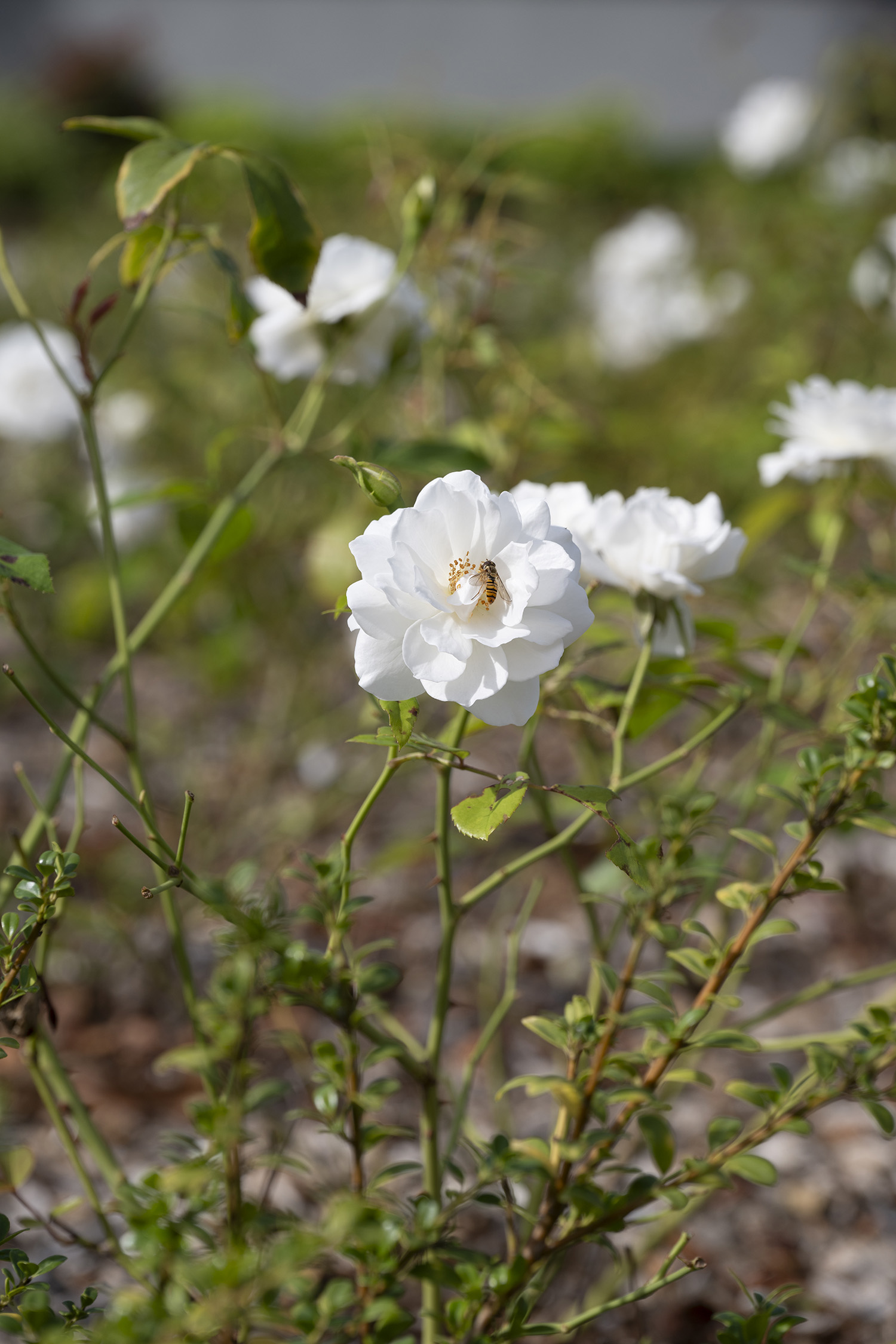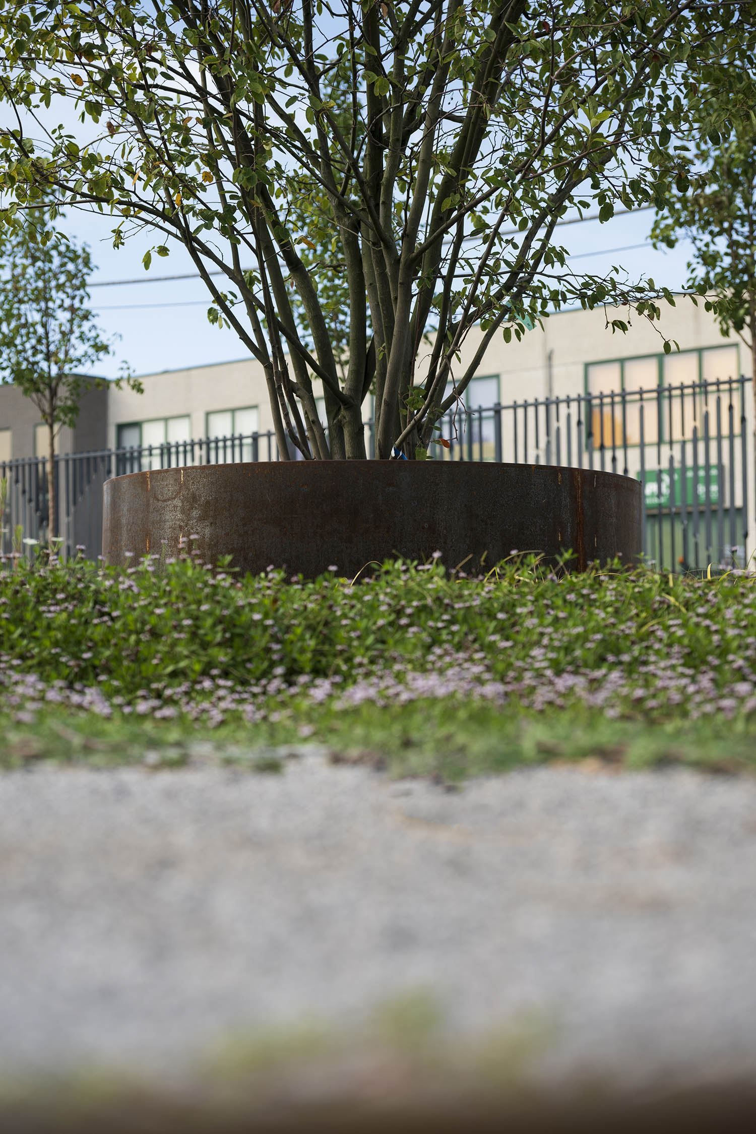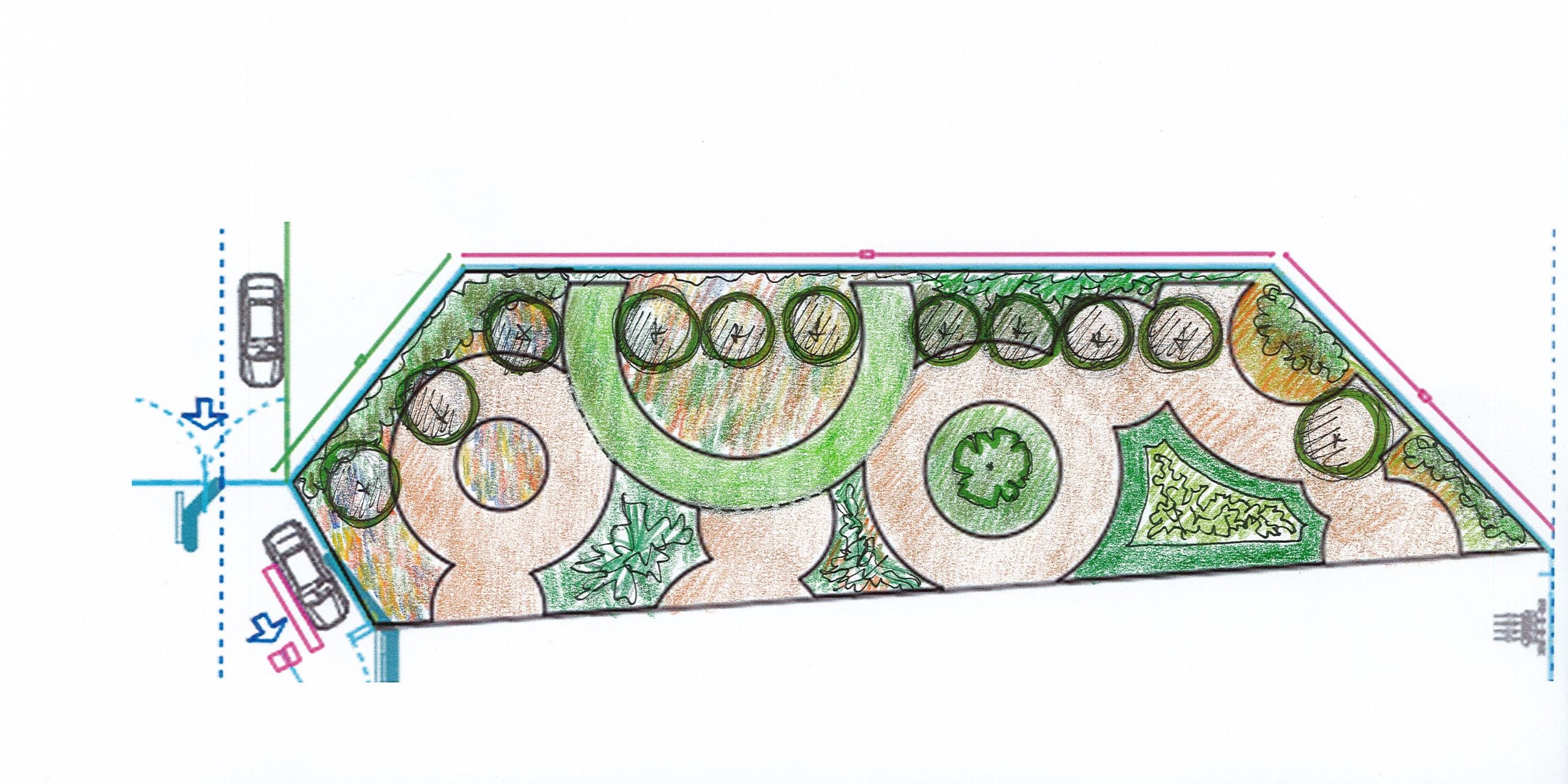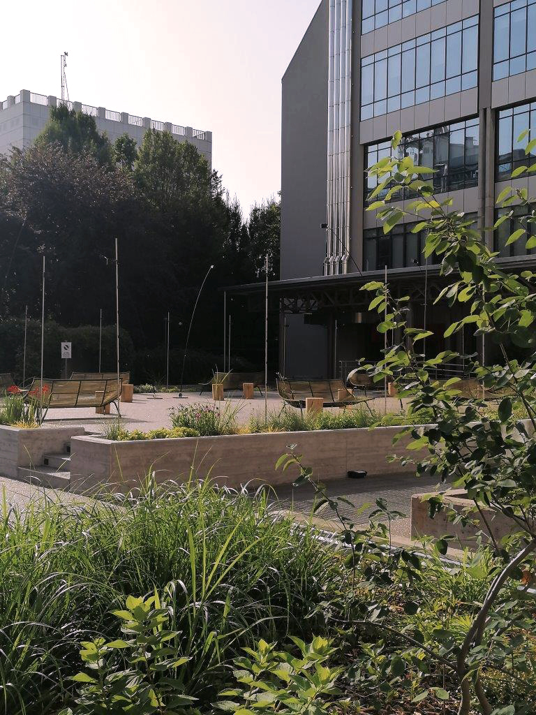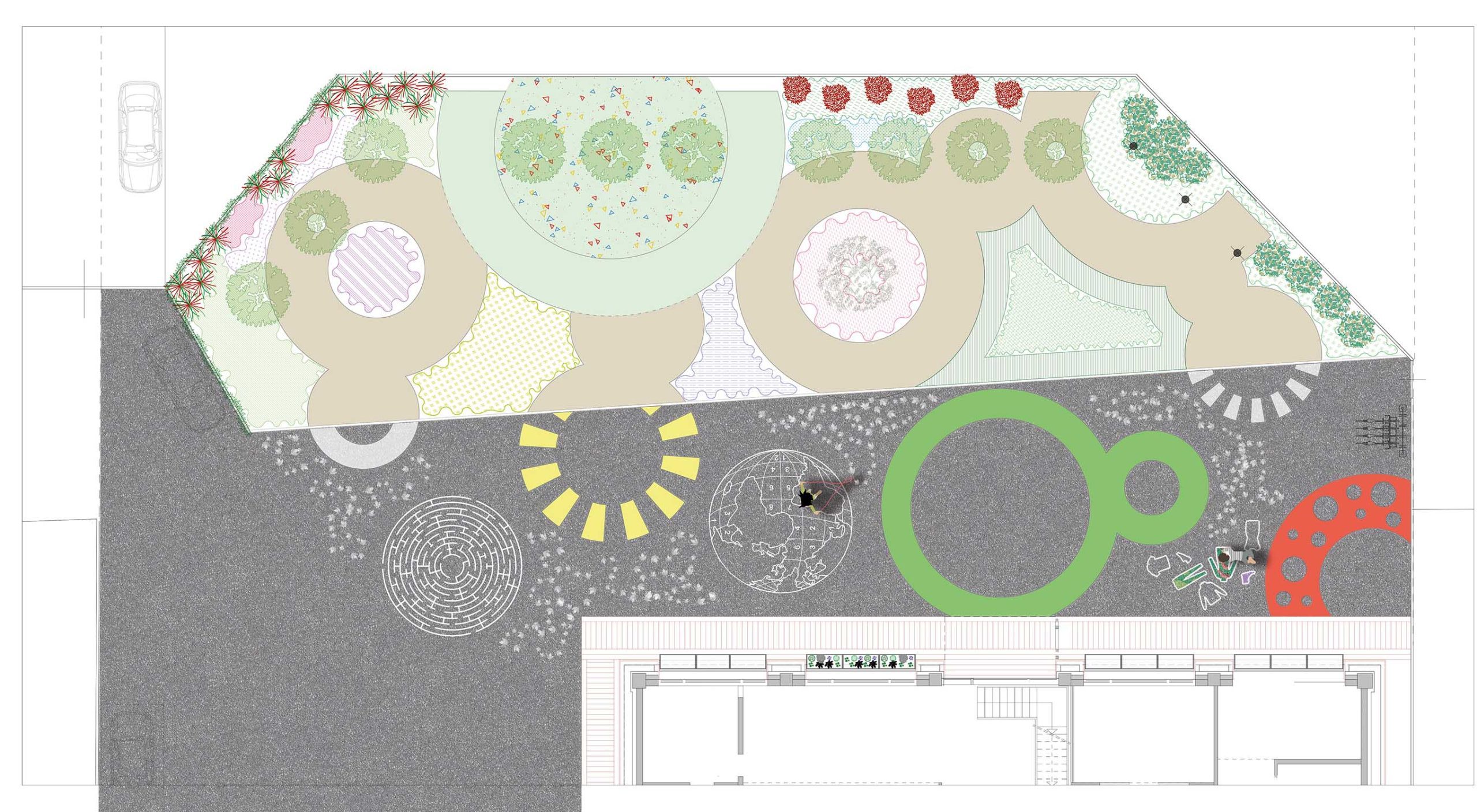 Lo spazio si organizza attorno a un segno chiaro e riconoscibile: un intreccio di quattro cerchi principali che si intersecano e si sfiorano, generando aiuole, percorsi e superfici a prato, e che si estende fino all’area parcheggio adiacente attraverso una grafica dipinta sull’asfalto.